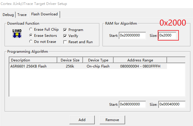 4.Project - Options for Tatget ‘project’- Debug - Settings-Flash Download - Add 找到并选择ASR6601 256KB Flash