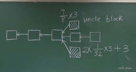 对于挖到了区块,但是没有成为最长合法链,这种区块被对于后面新加入最长合法链的区块来说,是它的叔父区块。如果最长合法链后面的区块包含了叔父区块,那么被包含的叔父区块会得到7/8的出块奖励,但是得不到gas fee,包含叔父区块的新区快会得到1/32的出块奖励。最多可以包含两个叔父区块。