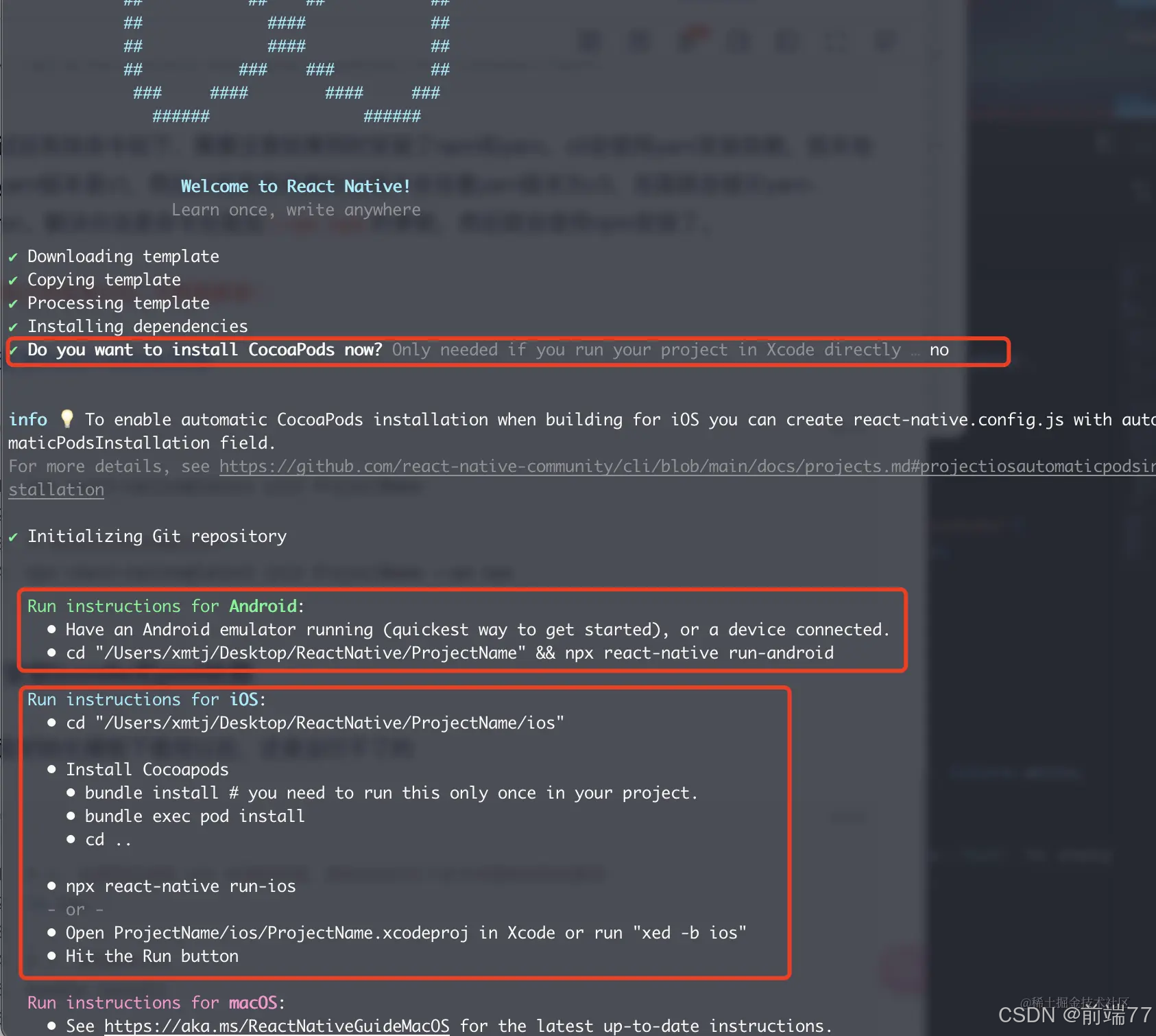 上面初始化模板下载完以后,如果选择了不安装cocoapods,那么项目现在还是运行不了的,需要下面命令,继续安装依赖。