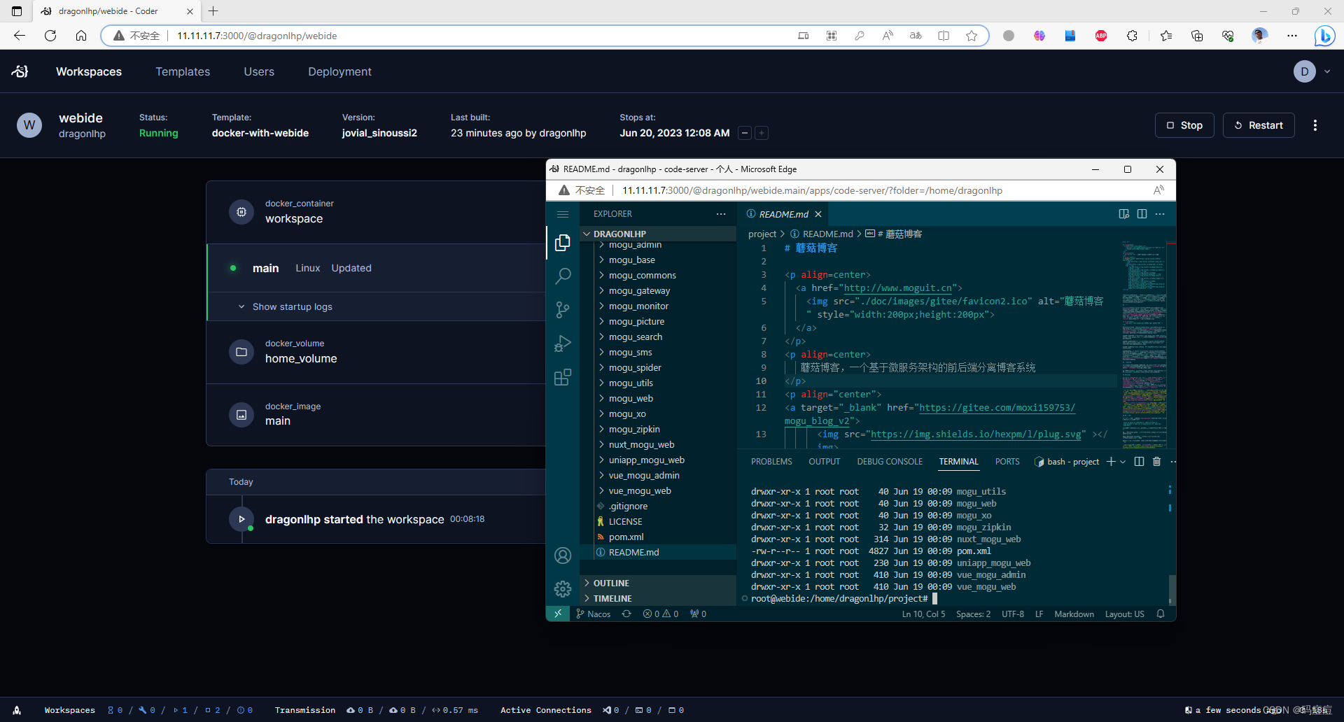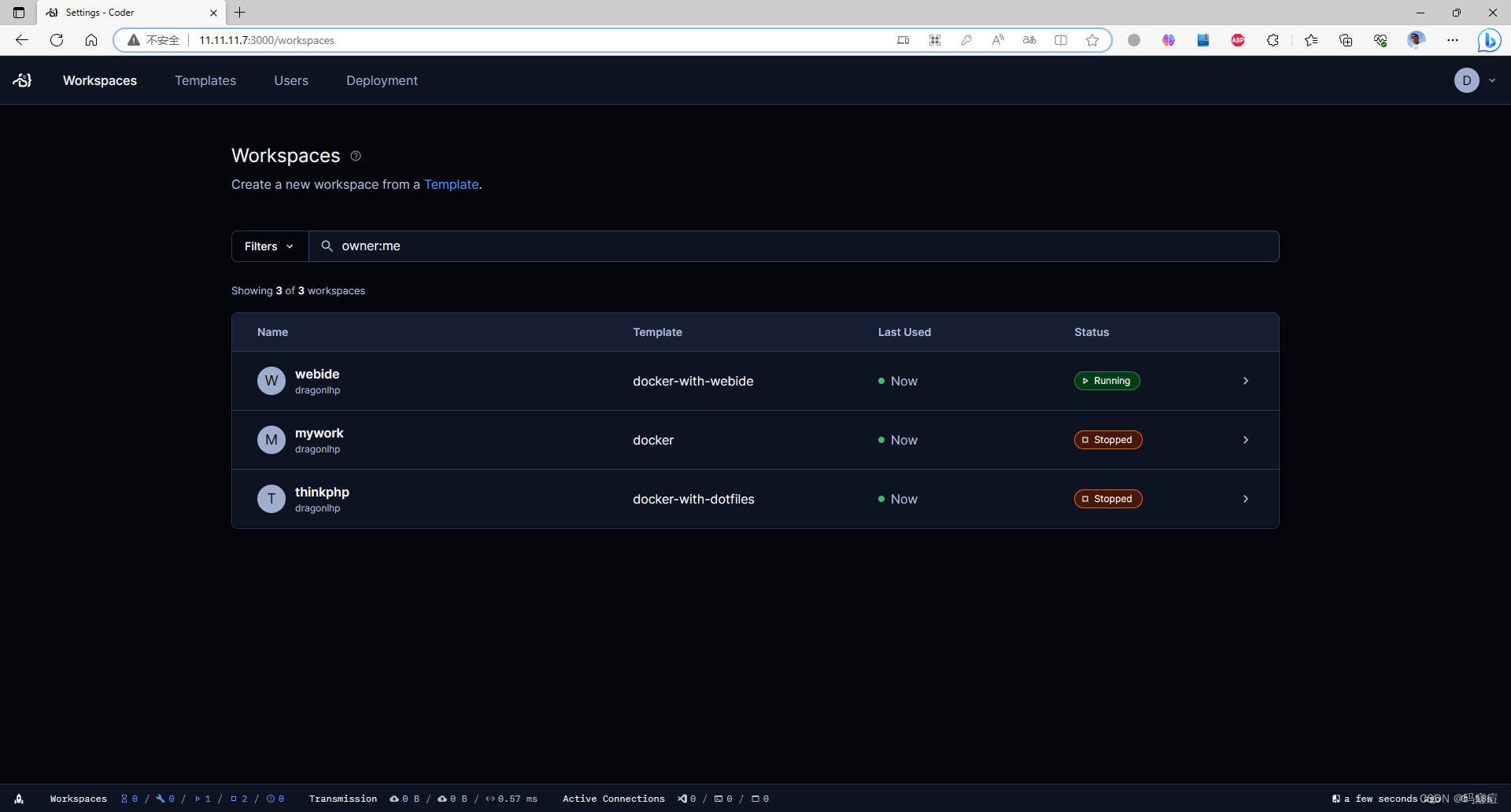 此方式需要解决生成的workspace工作空间容器需要访问到coder主容器,否则无法正常生成workspace工作空间容器,因为docker-compose.yml默认生成了一个网络,构建的workspace工作空间容器是使用的默认桥接网络。本项目也包含了两个模板 docker版本和docker-dotfiles_uri 版本,前者是完全自己构建项目开发空间,后者是自行构建空间同时拉取指定仓库的