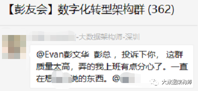 “这个群学习氛围很足,因为大家都在面临国家提出数字化转型的这个题目,一边思考一边学习,每个企业都有其特殊性和优缺点,在这里的观念碰撞可以使我们思路更加清晰,对未来的目标也更加肯定。每天在这里看大佬们聊天也是必修的功课。”