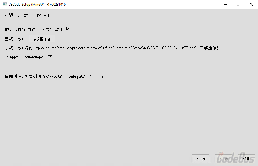 软件检测到 D:\App\VSCode\mingw64\bin\g++.exe 后,可以进行下一步操作。