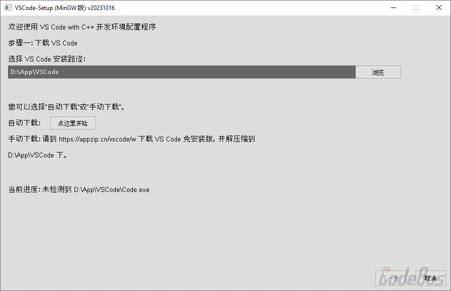 软件 VSCode-Setup(MinGW) 提供了自动下载安装 VSCode 并配置成 C/C++ 开发环境的功能。无需担心该软件会对系统有额外修改,每个步骤都有明确提醒,可以使用自动功能,也可以根据提示手动完成配置,都很方便。