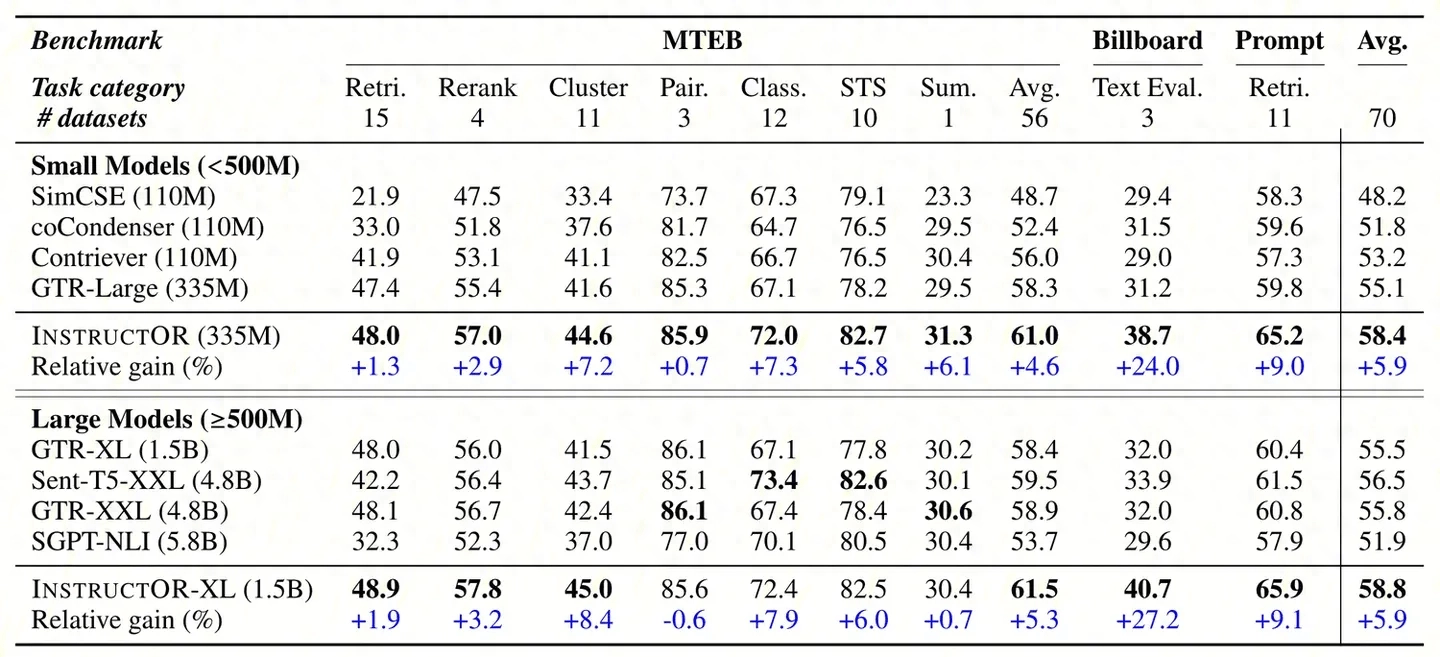 针对第二个问题,Instructor Embedding论文也给出了不同参数量模型的效果对比实验,如下表: