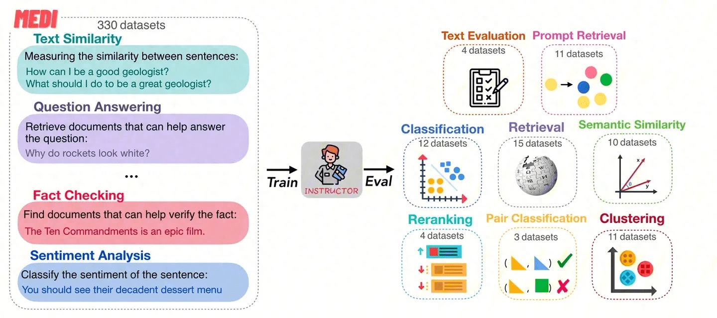 而我们理想的Embedding显然应该同时具备多种能力。怎么能让Embedding模型同时适应多个任务,并且在新领域上有泛化性呢?