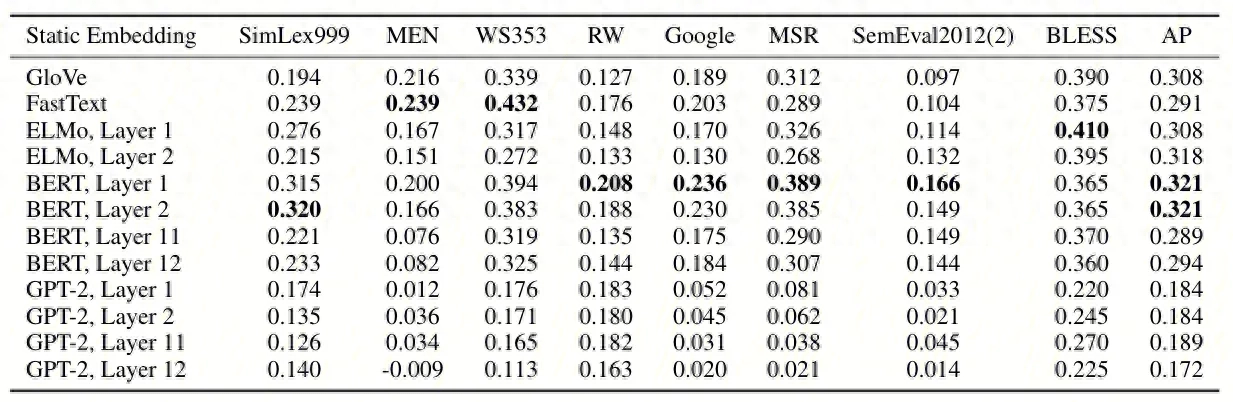 针对第一个问题,《How Contextual are Contextualized Word Representations? Comparing the Geometry of BERT, ELMo, and GPT-2 Embeddings》论文进行了BERT和GPT不同层效果对比的探究实验,实验效果如下表: