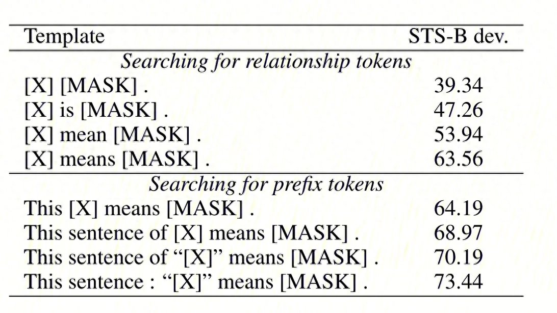这篇工作的核心就是想用Prompt来产生句子表示。作者认为,原生BERT表现不好主要是因为词语频率、大小写、subword等token导致的bias,而BERT本身各层Transformer都没有纠正这个问题。通过利用prompt,可以更有效地使用BERT各层中的知识,并且用[MASK]来表示embedding的话,可以避免像以前一样做各种token的平均,从而避免了token引入的偏差。