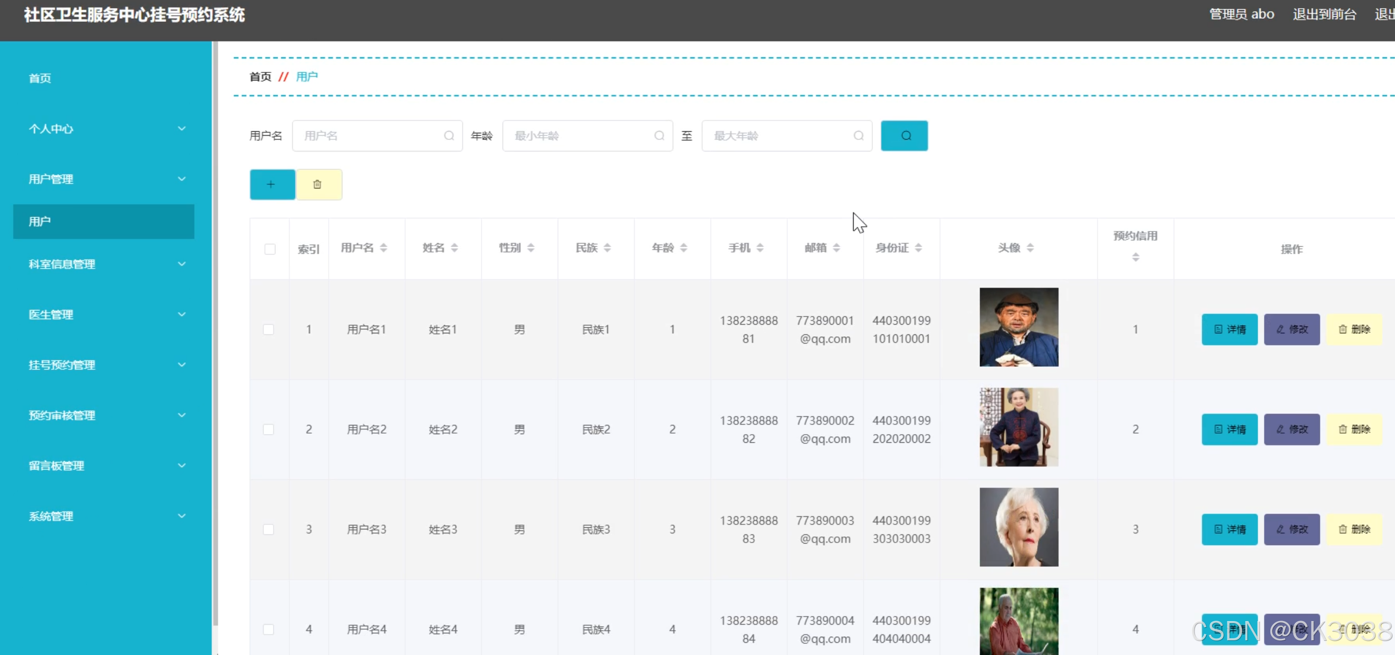 - 数据表包括用户信息表、医生信息表、挂号信息表等。