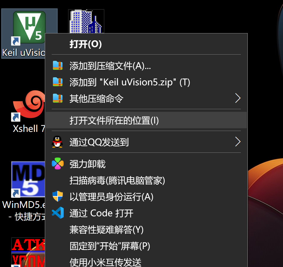 我们右键Keil uVision5桌面图标,选择打开文件所在的位置。