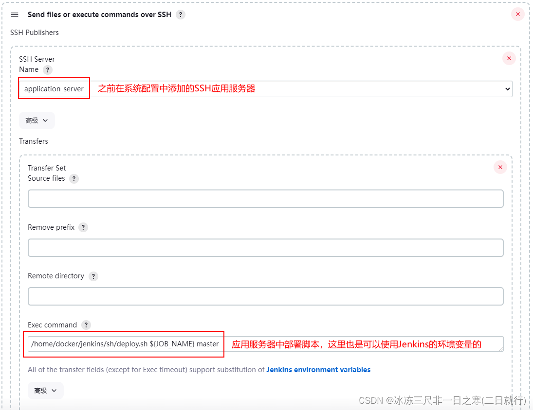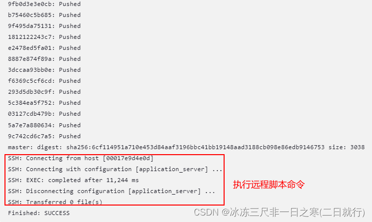 向应用服务器发送脚本命令,拉取镜像并运行服务(通过Publish Over SSH)。