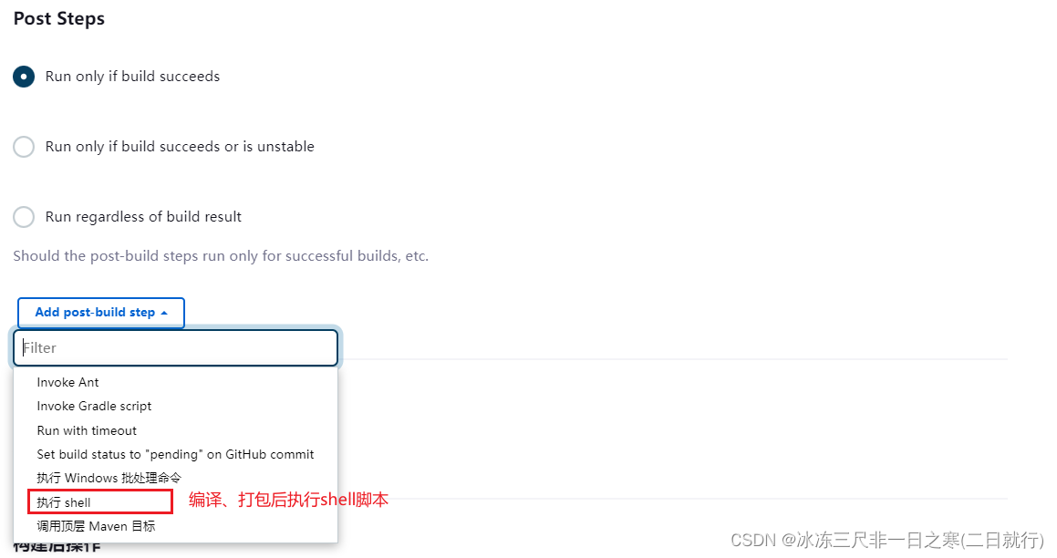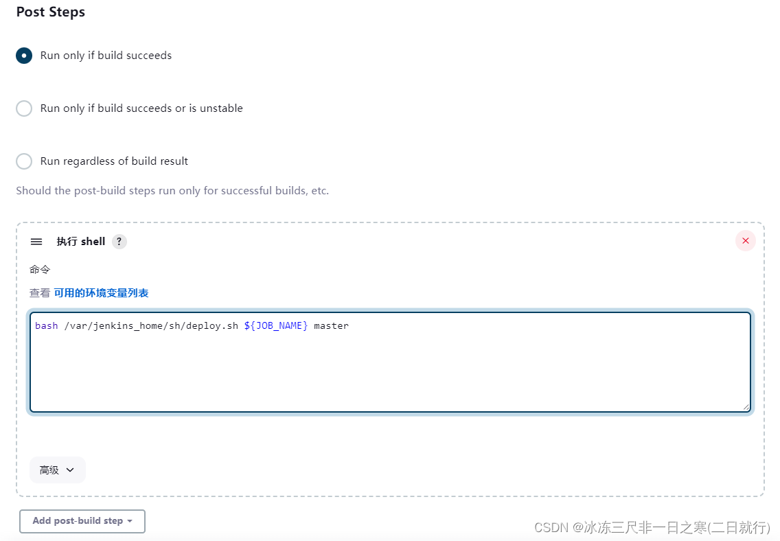 前面的步骤可以参照【Docker+Jenkins+Gitee自动化部署maven项目】一文,我们这里会对Post Steps环节进行补充,即执行后置脚本。