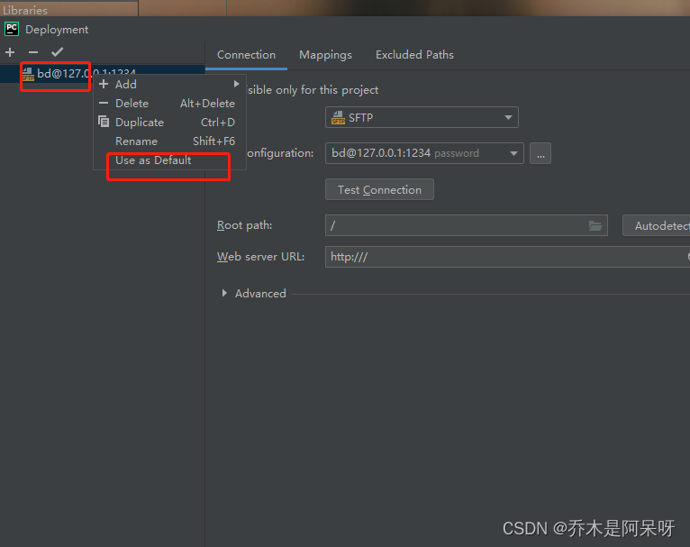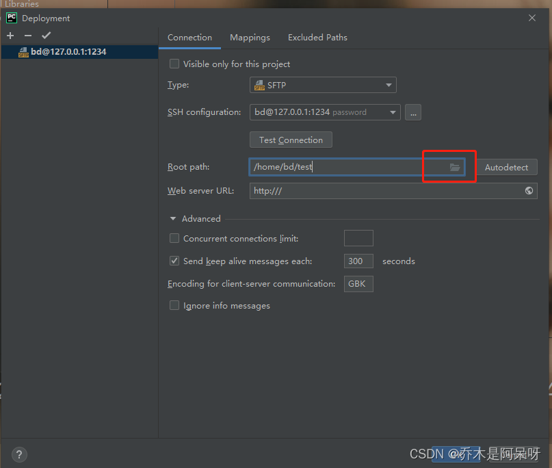 h.点击connection,里面的root Path切换成在虚拟机中创建的保存代码的文件夹;