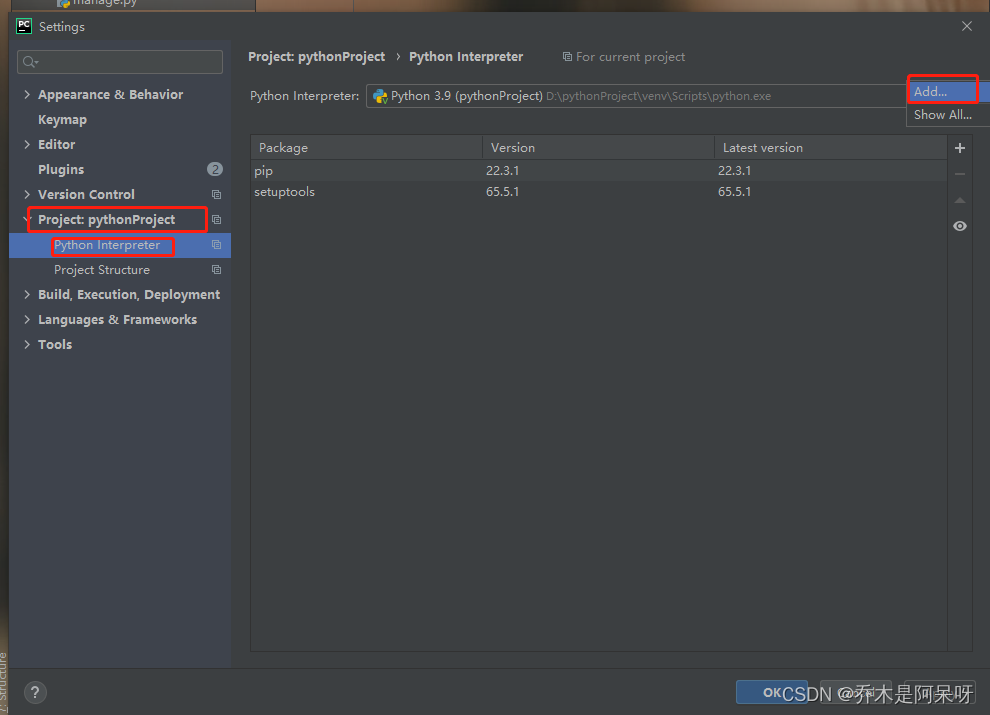 c.找到Project:项目名,再点击Python Interprter,去查看当前项目文件使用的环境和所有的环境,通过查看,可以发现目前使用的是虚拟环境,再点击右上角的小齿轮里面的add;