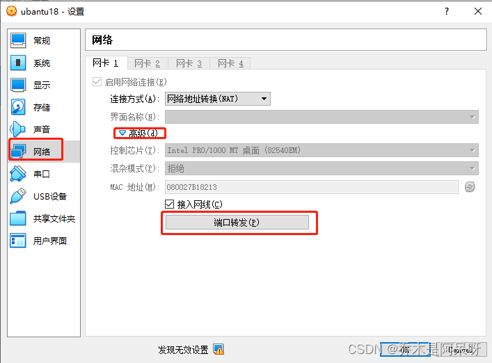 b. 进入设置后,选择网络,点击高级下的端口转发;