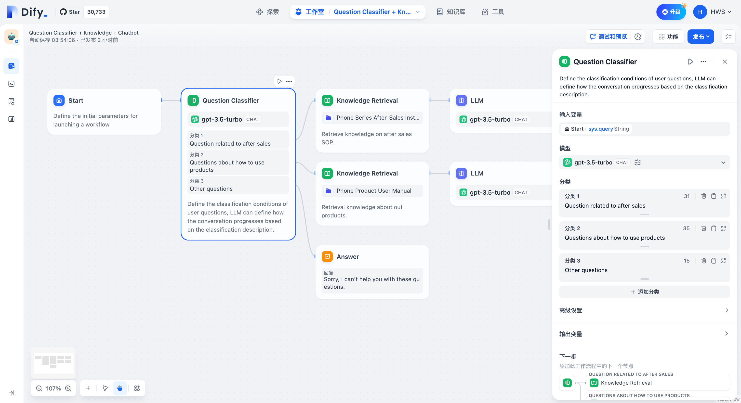 通过定义分类描述,问题分类器能够根据用户输入,使用 LLM 推理与之相匹配的分类并输出分类结果,向下游节点提供更加精确的信息。