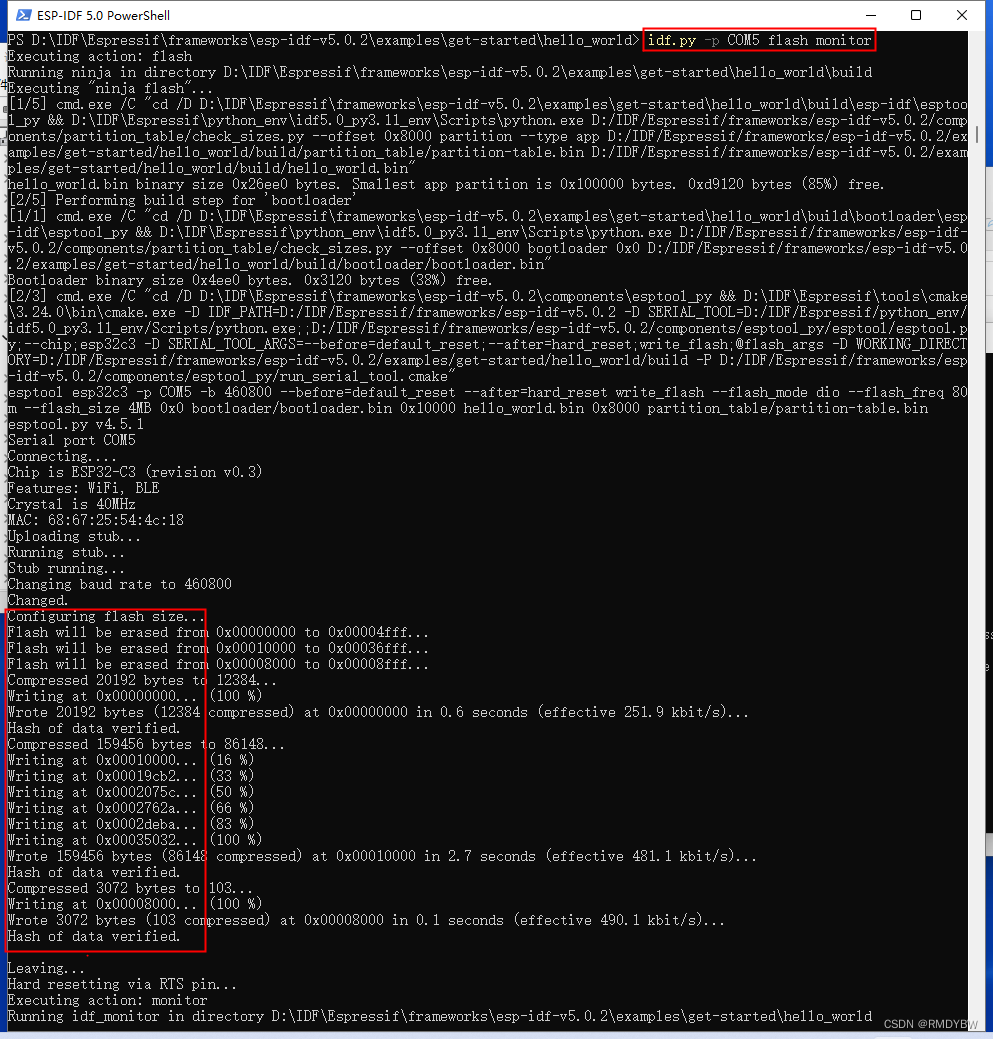 输入指令idf.py -p [port] flash就可以将.bin文件下载到WiFi模组中了,如果想要监视运行现象则输入指令idf.py -p [port] flash monitor就可看到运行的日志。