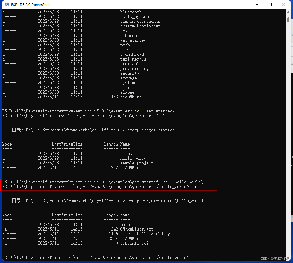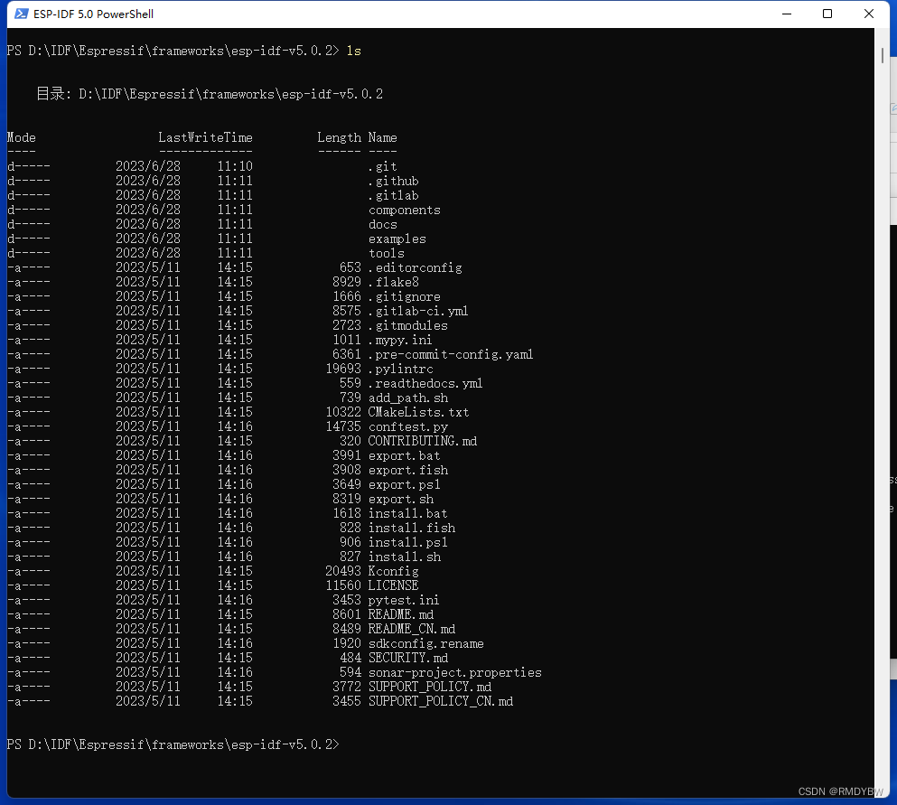 使用‘ls’指令,可以看到在目录:D:/IDF/Espressif/frameworks/esp-idf-v5.0.2中有很多文件,这个就是esp-idf-v5.0.2的工程结构,我们可以使用“examples”中的例程进行开发。