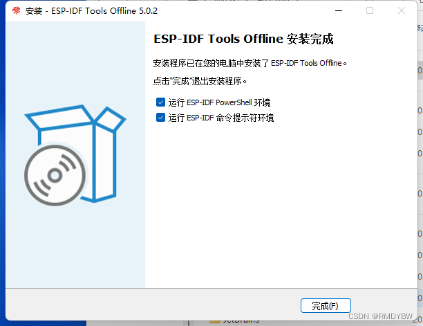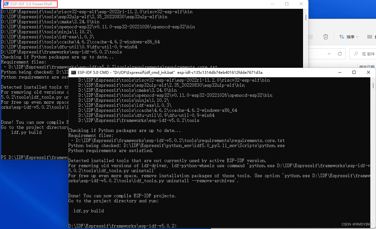 点击“完成”会打开两个终端,到这里IDF就安装好了。电脑桌面也会有两个终端的快捷键,我在开发的时候一般使用“PowerShell”这个终端。