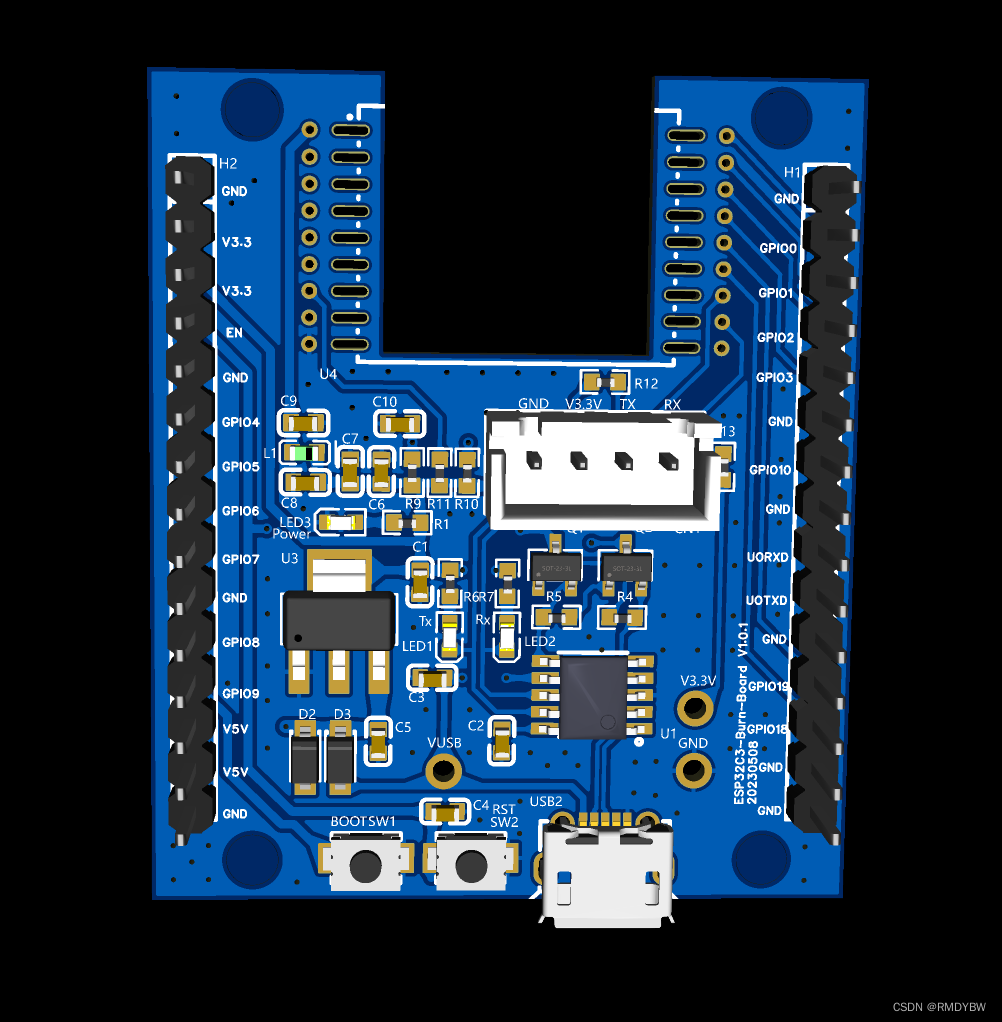 板子如下所示,是基于嘉立创EDA设计的,喜欢的朋友可以私信我(或者到我主页的“下载”中的“ESP32C3-WROOM-02U 开发板&烧录板二合一的制板资料”下载)拿Gerber PCB制板文件和BOM,就可以直接在嘉立创免费制版了。原理图和PCB图不打算开放朋友们可以自己设计。