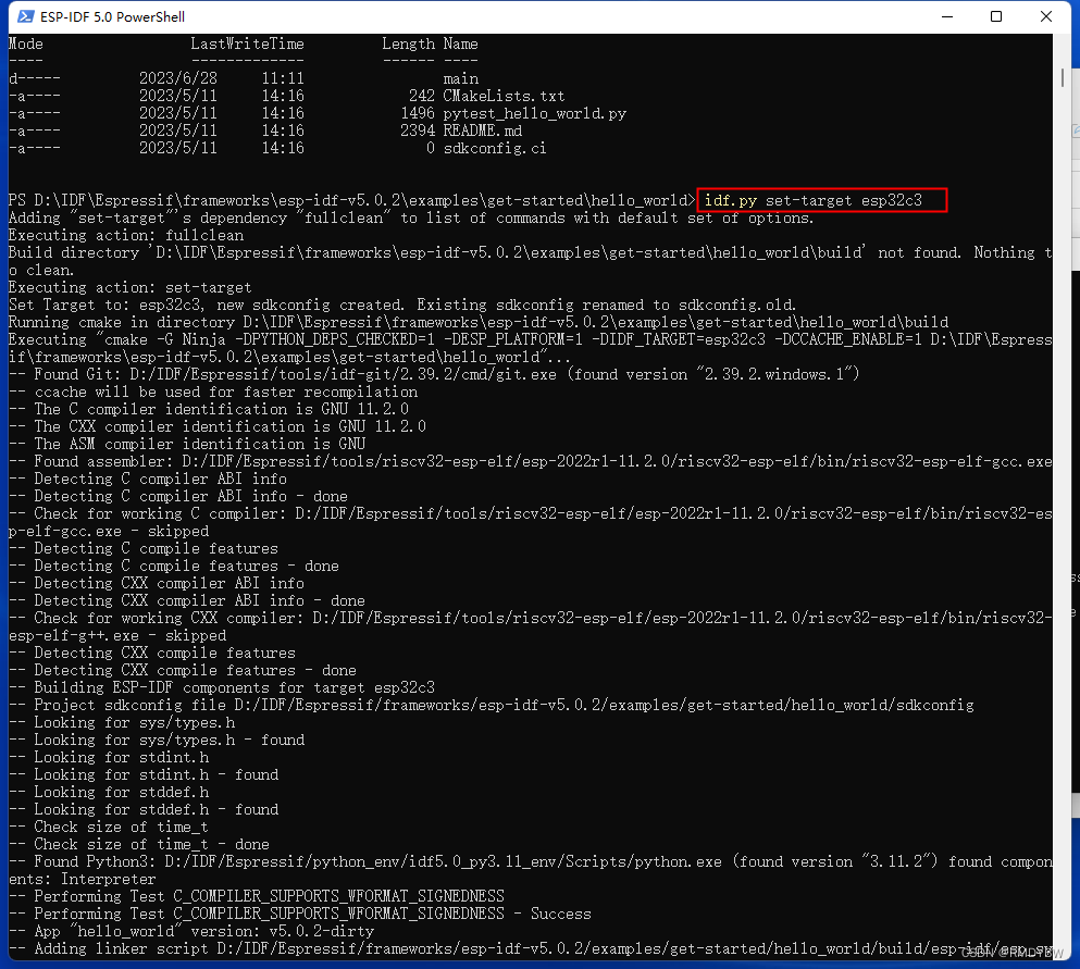 输入idf.py set-target esp32c3设置对应WiFi模组型号