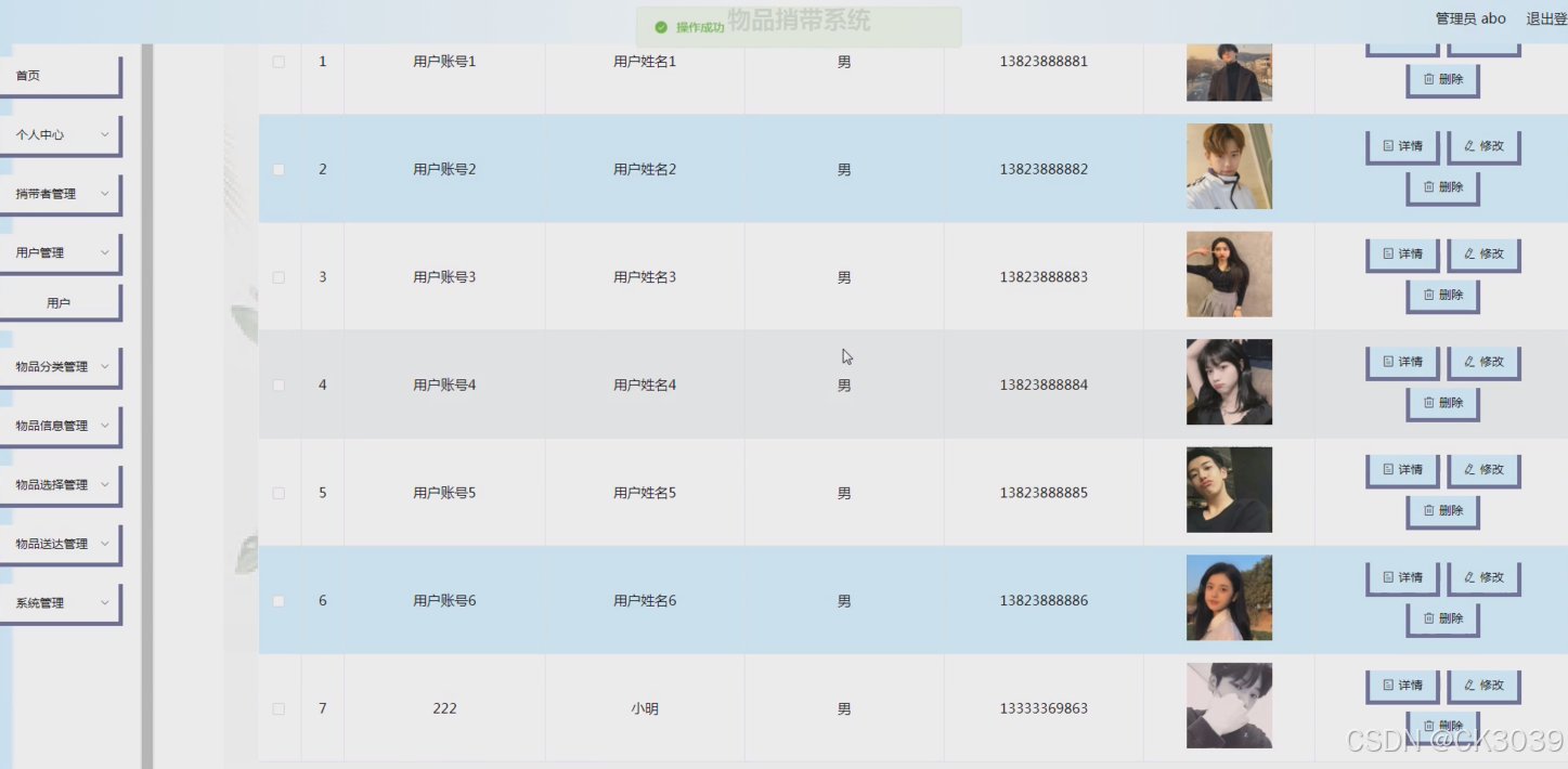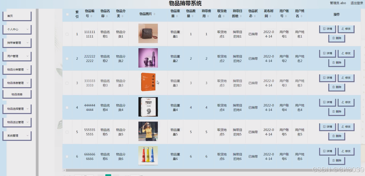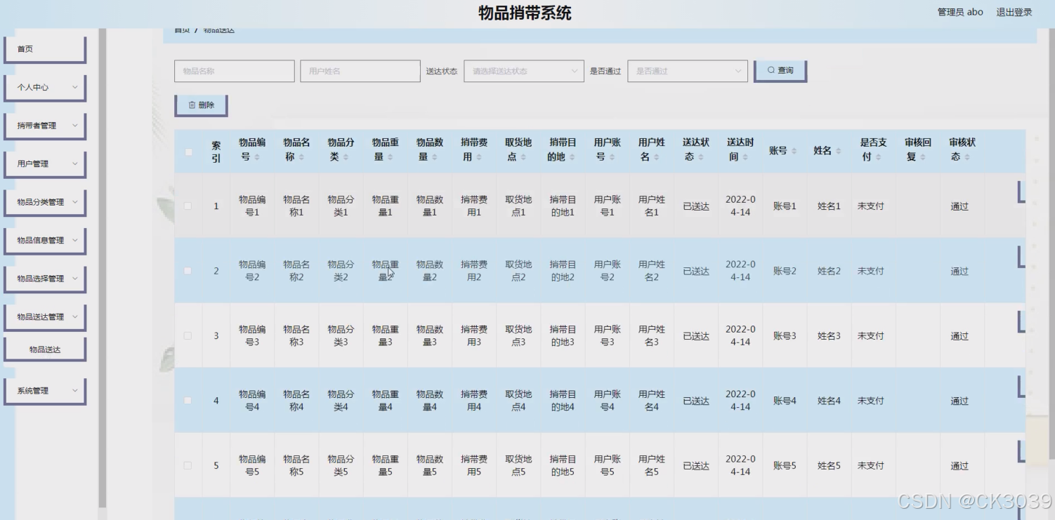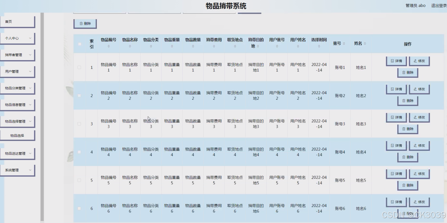 - 管理员功能:个人中心、捎带者管理、用户管理、物品分类管理、物品信息管理、物品选择管理、物品送达管理、系统管理等。