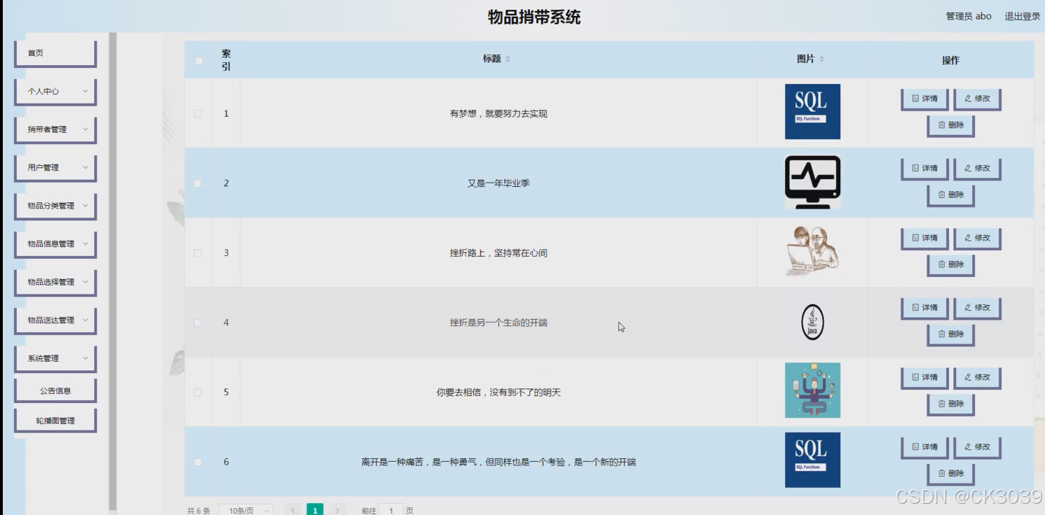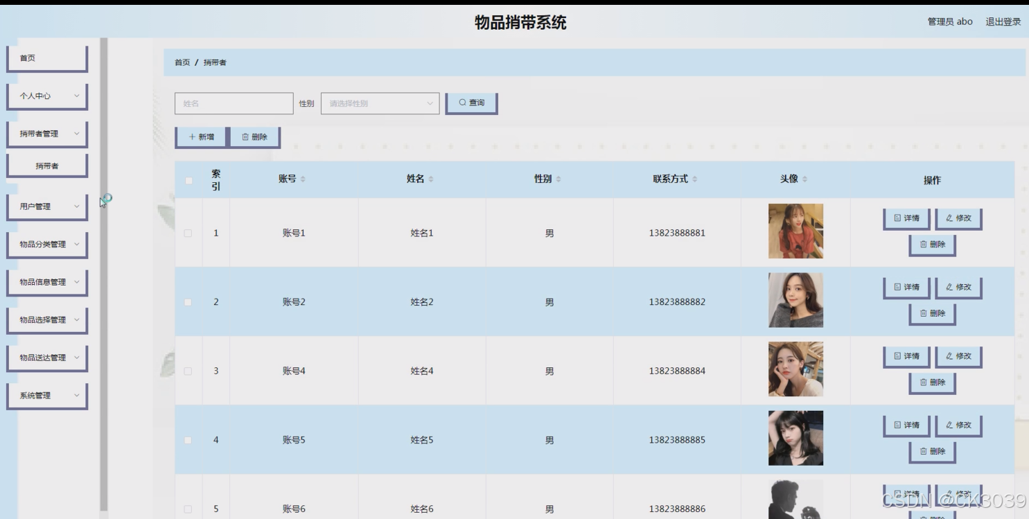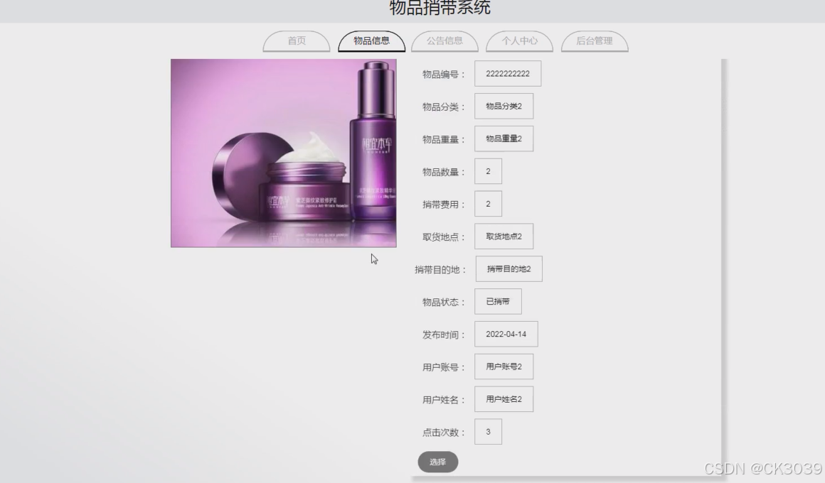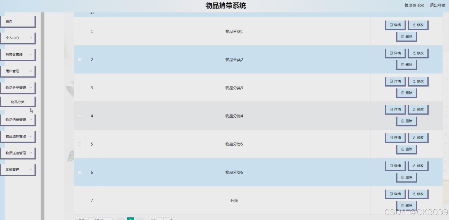 - 管理员功能:个人中心、捎带者管理、用户管理、物品分类管理、物品信息管理、物品选择管理、物品送达管理、系统管理等。
