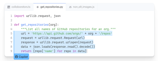 目前,GitHub Copilot 支持 Python、JavaScript、TypeScript、Java、Ruby 和 Go 等编程语言。可以根据上下文自动写代码,包括文档字符串、注释、函数名称、代码,只要用户给出提示,就可以写出完整的函数。