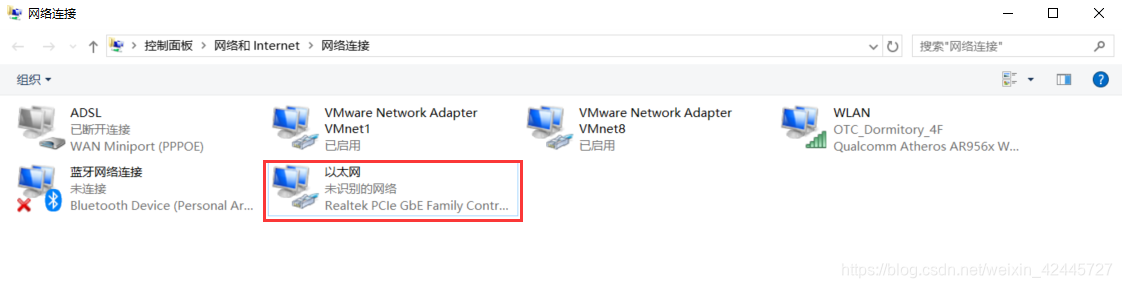 控制面板-> 网络和Internet-> 网络连接,可以看到PC端与开发板是通过那个网卡A连接的。