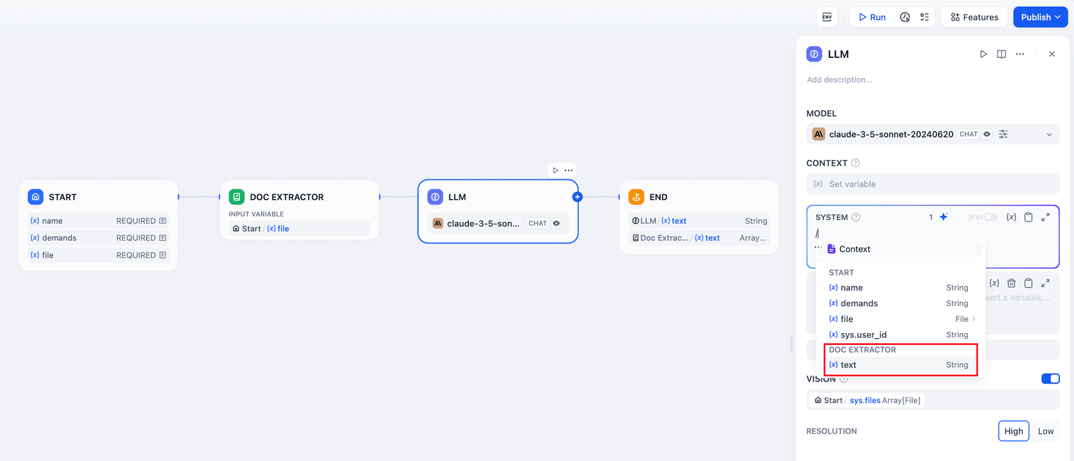 - 在 LLM 节点上游添加文档提取器节点,将文件变量作为输入变量;