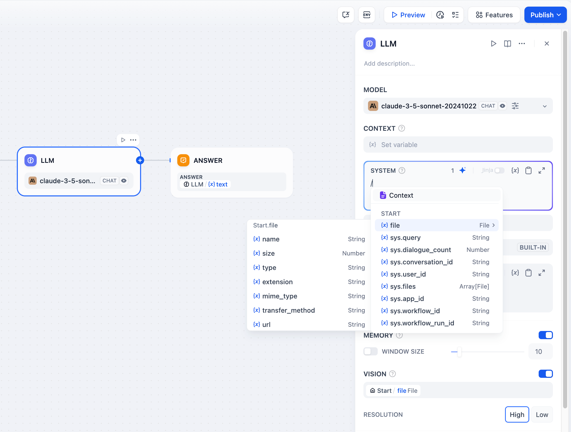 部分 LLMs(例如 Claude 3.5 Sonnet)已支持直接处理并分析文件内容,因此系统提示词已允许输入文件变量。为了避免潜在异常,应用开发者在使用该文件变量前需前往 LLM 官网确认 LLM 支持何种文件类型。