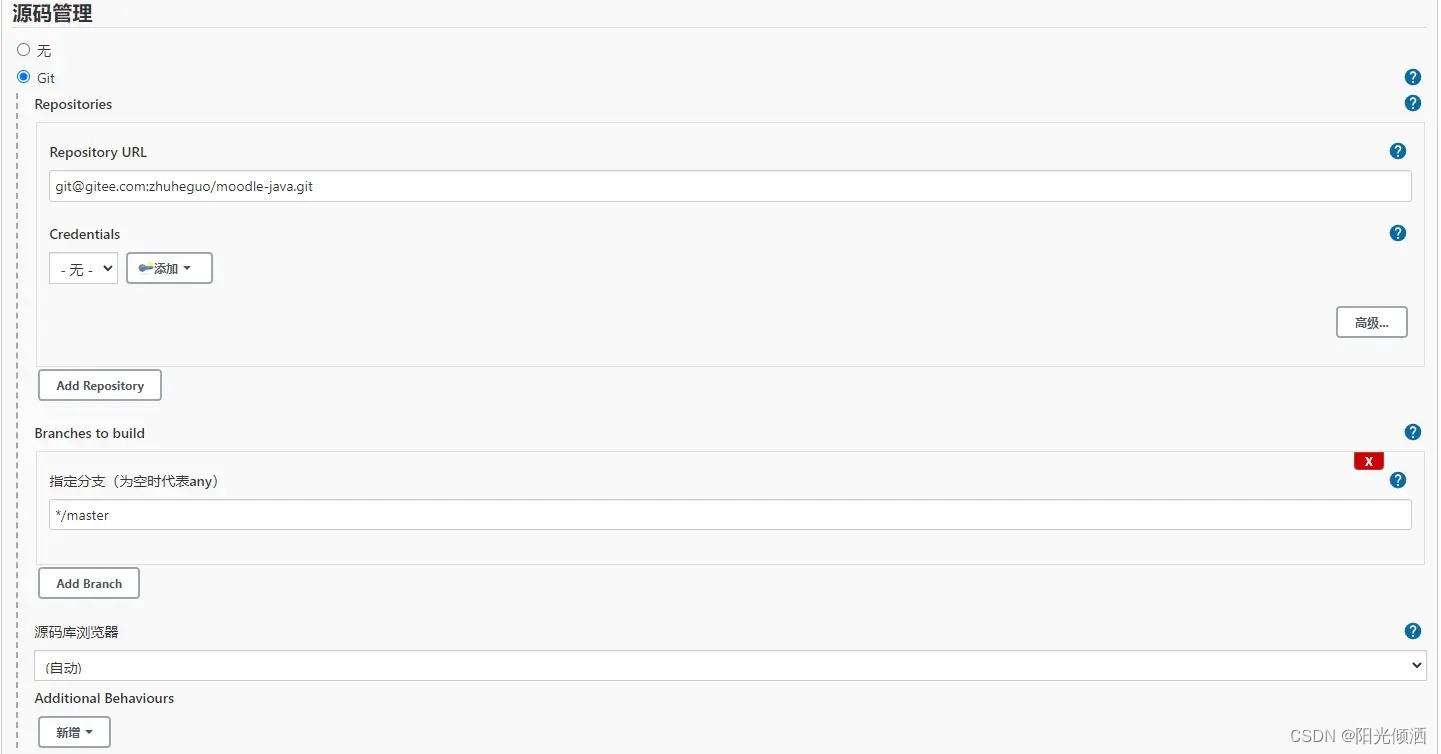 填写源码地址 注意:请确保genkins所在的服务器有权限git拉取远程仓库代码,如果不可以请参考ssh配置