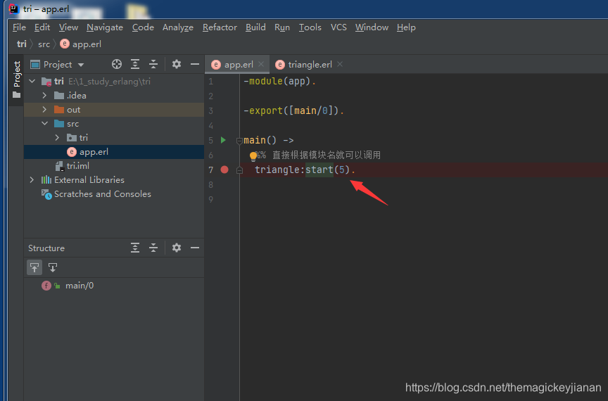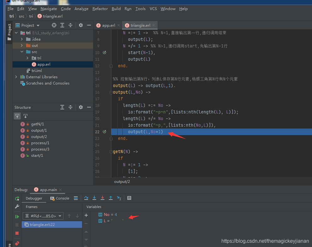 triangle.erl(杨辉三角实现类,可以看出idea下断点调试是非常方便的)