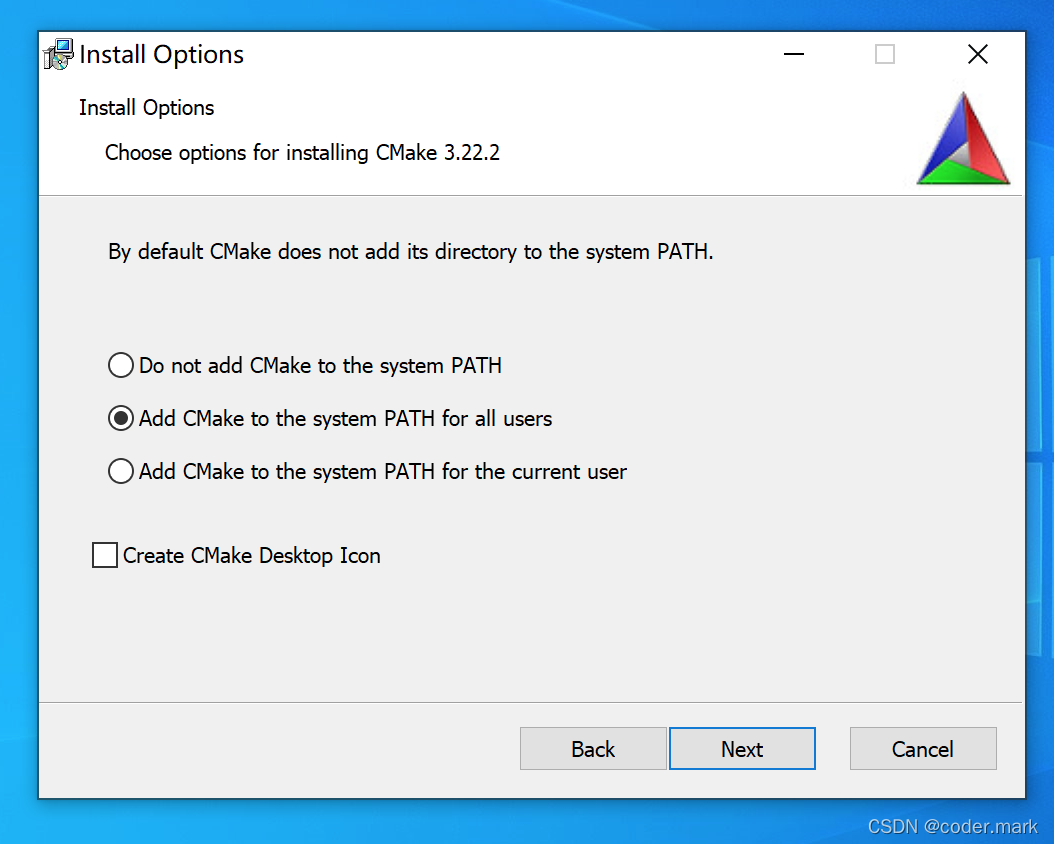 一定要选中Add CMake to the system PATH for all users,然后继续