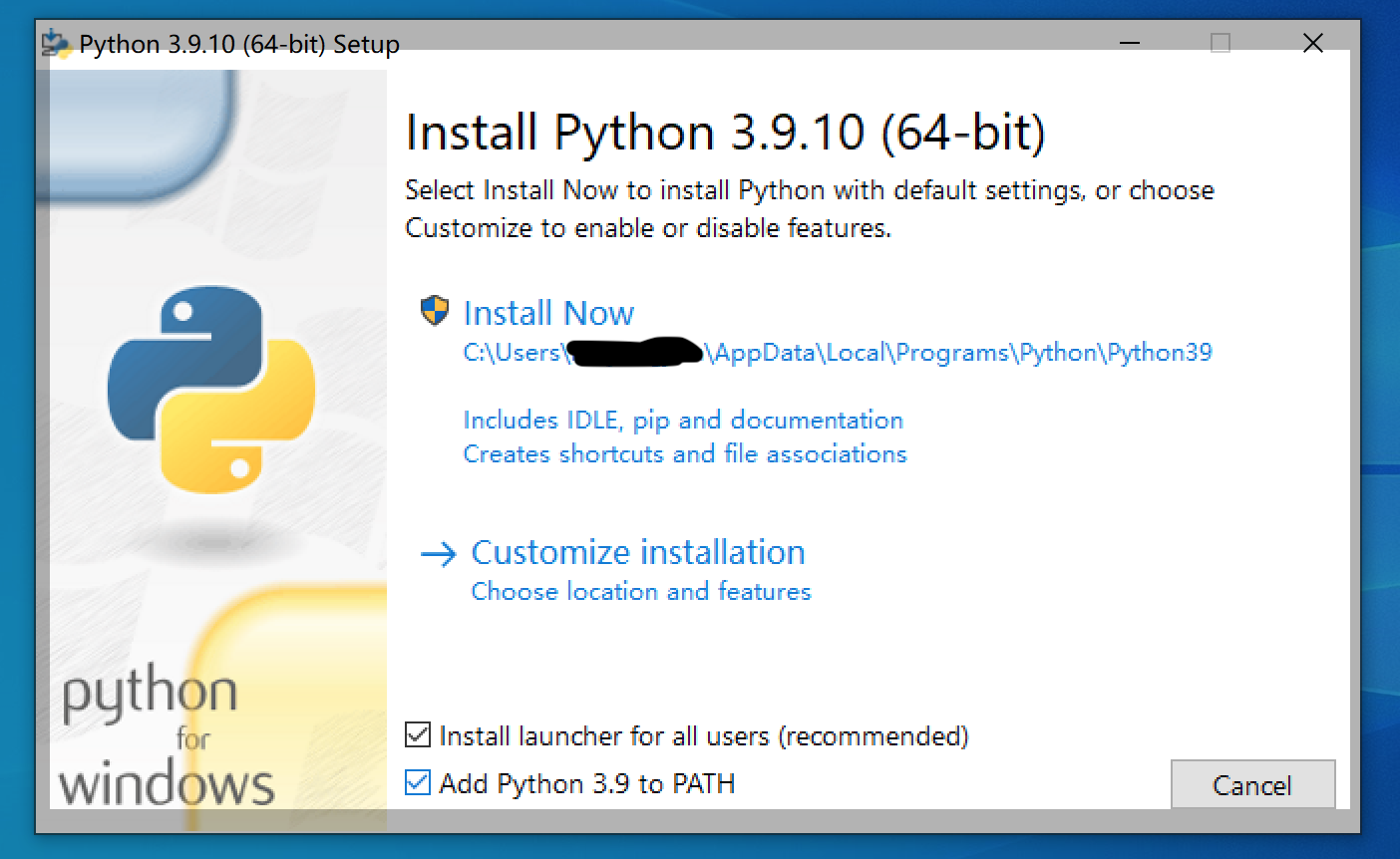 一定要把Add Python 3.9 to PATH选中