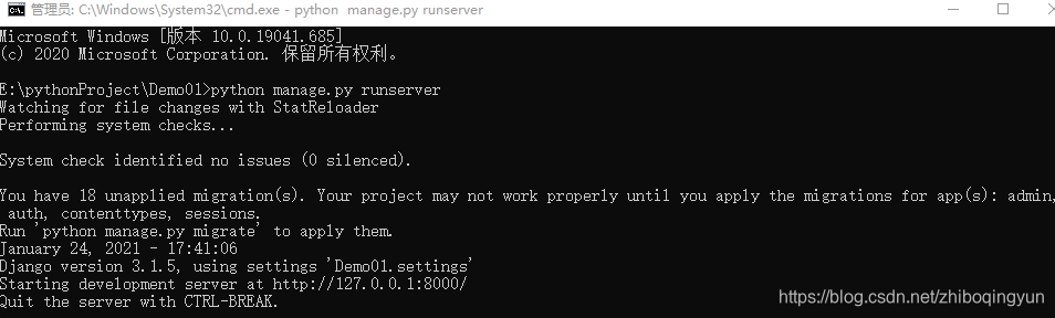 5、启动服务:在cmd命令行下输入:python manage.py runserver(cmd命令下先进入Demo01所在的目录)