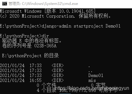1、创建项目,此处想在E:\pythonProject,创建Demo01项目(E:\pythonProject,换cmd,回车,即可进入黑窗口dos)