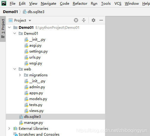 4、创建应用:在cmd命令行下输入:python manage.py startapp web (cmd命令下先进入Demo01所在的目录)