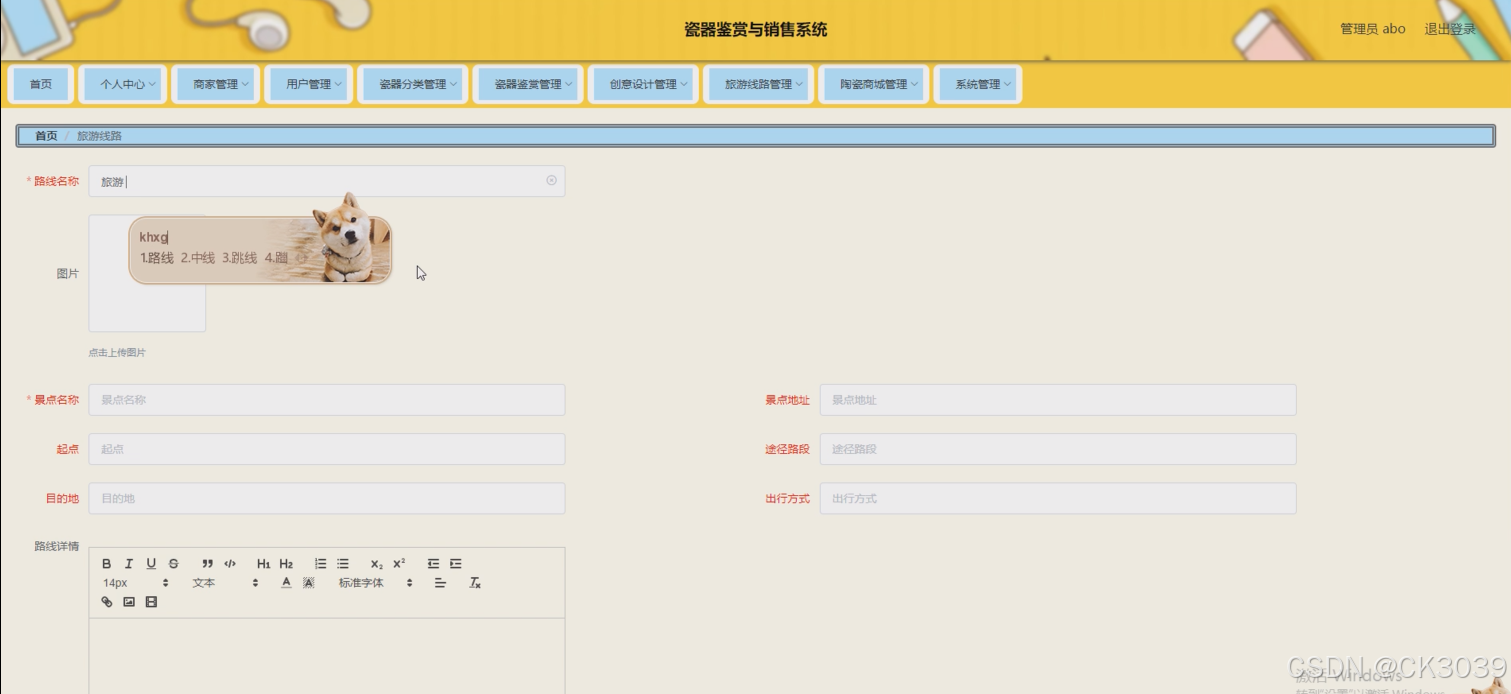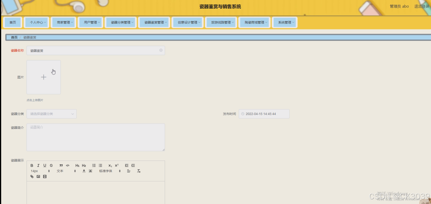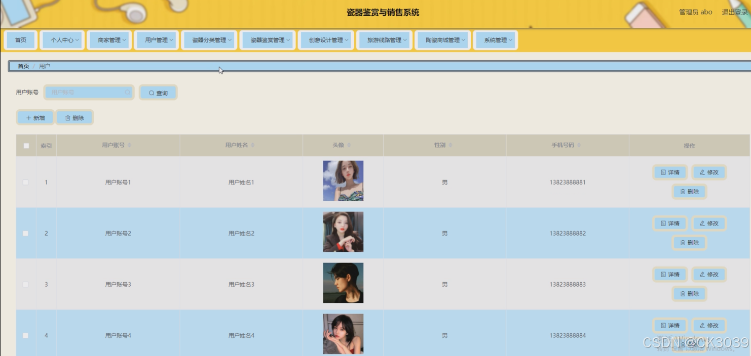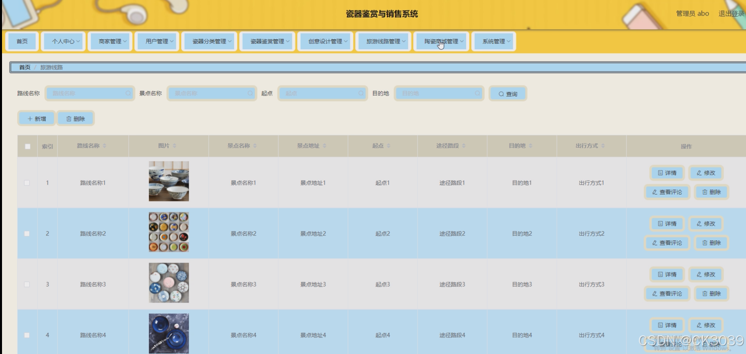 用户,瓷器分类,瓷器鉴赏,创意设计,商家,旅游线路,陶瓷商城