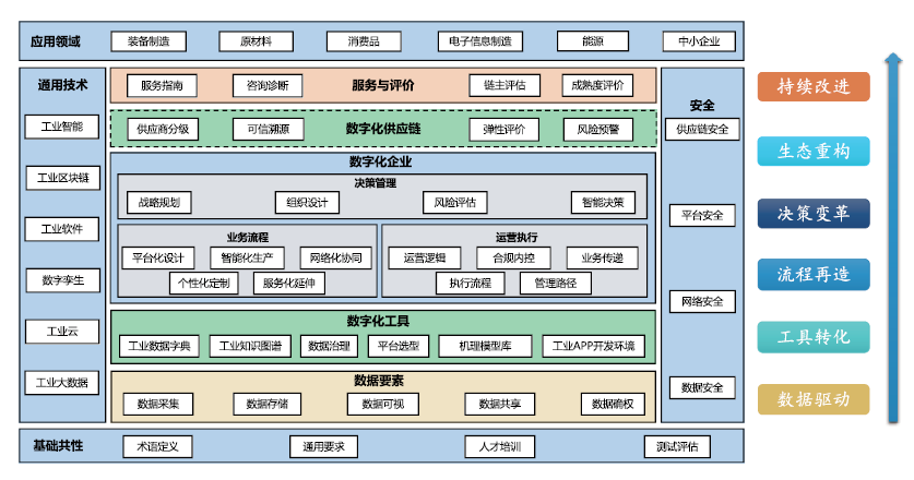 以"数据驱动、工具转化、流程再造、决策变革、 生态重构、持续改进”的制造业数字化转型标准化路线为指引,在已开展标准化工作、标准化需求的基础上形成标准框架,提出了引导和规范企业数字化转型的重点标准方向。回答企业转型"用何转"的问题。