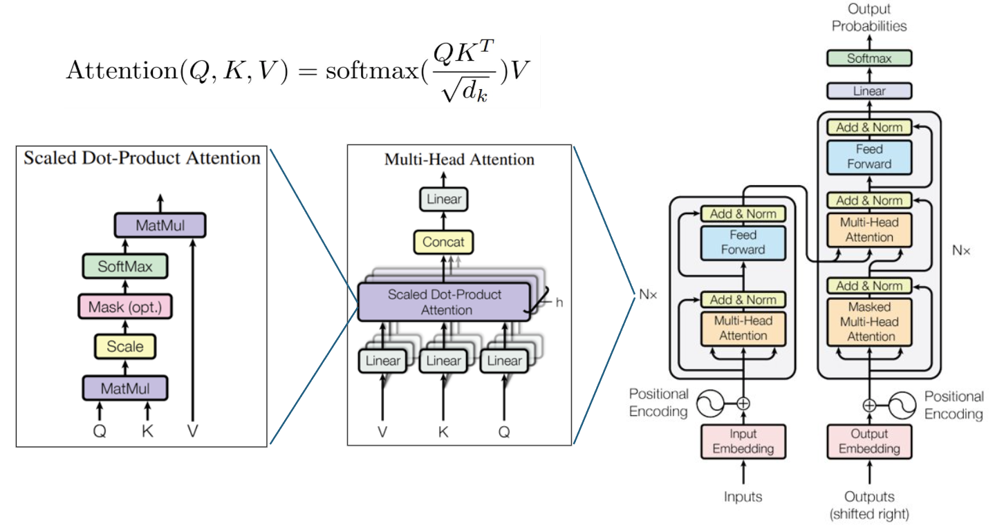 多头注意力通过多个注意力头并行计算,每个头在不同的子空间中独立地关注输入的不同部分,最终,将所有注意力头的输出拼接起来,并通过一个线性层进行映射。假设Q,K,V的维度为(N,d),其中N是序列长度,d是特征维度。设定头的数量为h,每个头的维度为,使用不同的线性变换矩阵,将查询、键、值映射到多个子空间: