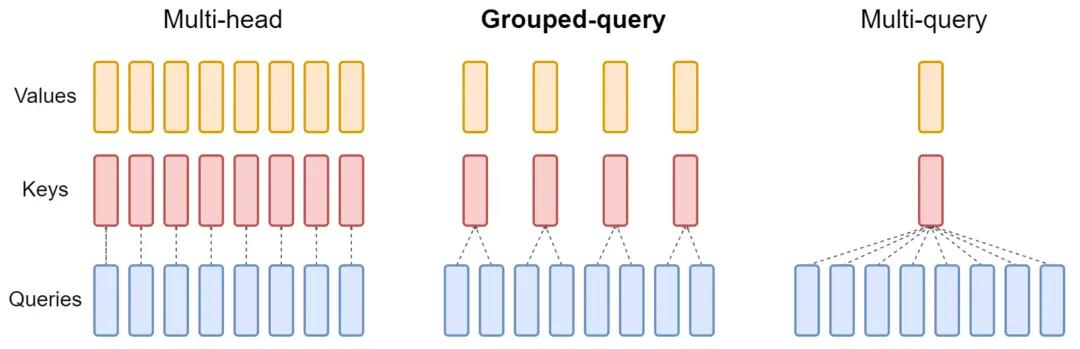 多查询注意力(MQA)、分组查询注意力(GQA)是Transformer中多头注意力(MHA)的变种,它们提高了解码器的推理效率,降低了模型的显存开销,目前在大模型中广泛应用。MQA的原理很简单,它将原生Transformer每一层多头注意力的Key线性映射矩阵、Value线性映射矩阵改为该层下所有头共享,也就是说K、V矩阵每层只有一个,这种方式大幅减小了参数数量,带来推理加速的同时会造成模型性能损失,且在训练过程使得模型变得不稳定,因此在此基础上提出了GQA,它将Query进行分组,每个组内共享一组Key、Value,令组的数量为N,若N等于1此时等效于MQA,若N等于Query头的数量,此时退化为MHA。GQA是推理效率和模型性能的trade-off。