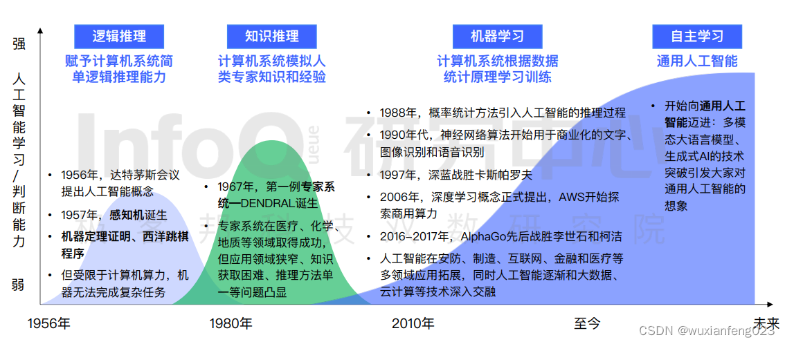 转自INFOQ的《2023 中国人工智能成熟度模型报告.pdf》人工智能发展的四个阶段。