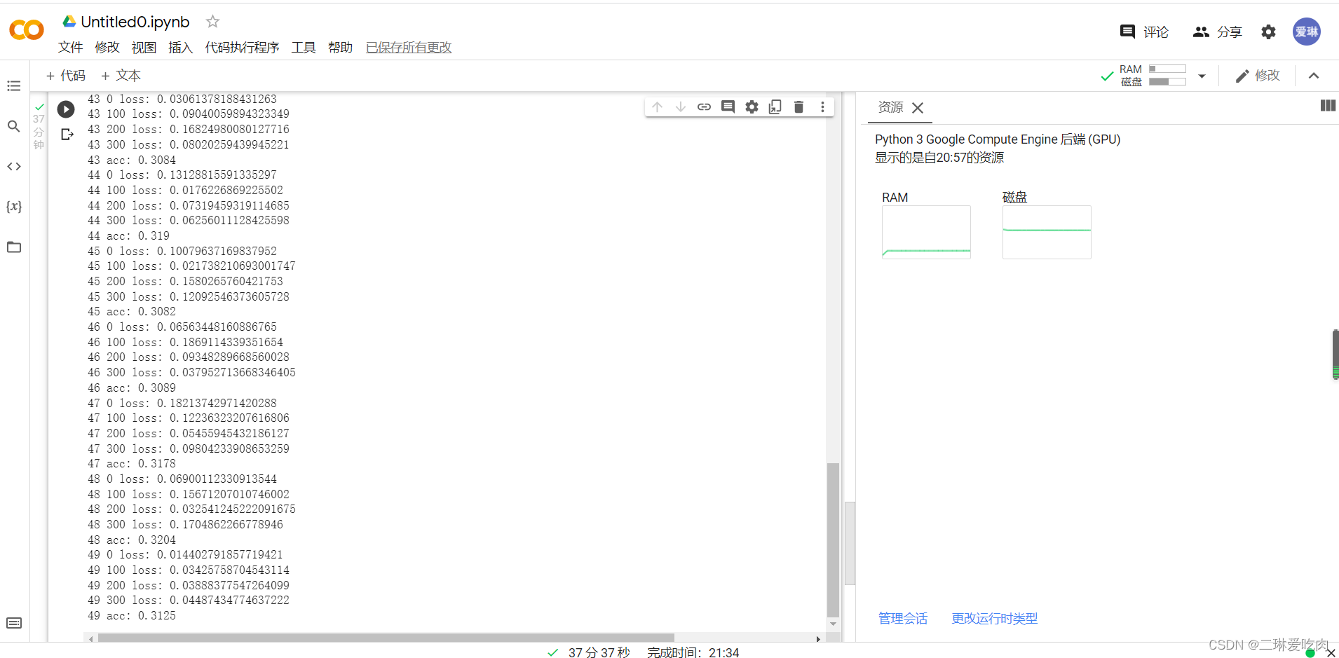 12月7更新:下载了某助手之后,发现可以使用colab,同一个程序在colab上跑了大概有37分钟就跑完了,感觉跟在自己的机子上跑快太多太多了,下面是我在colab上的结果: