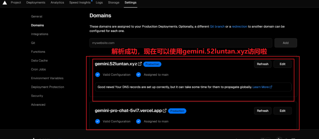 然后回到Vercel平台找到我们的项目,在Setting-Domains输入刚才我们添加的二级域名,然后点击Add按钮,等待解析完成,按如下图操作。