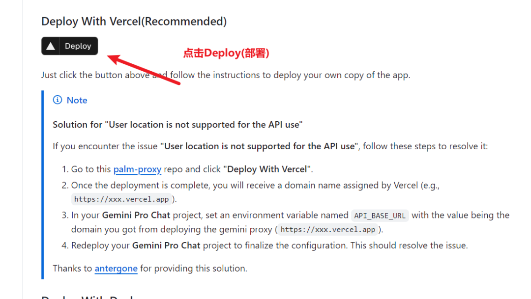 懂编程的小伙子,访问这个项目,跟着步骤进行本地搭建,也可以通过 Vercel 平台进行一键部署,完全免费,访问开源项目 GeminiProChat后,下拉页面,找到Deploy,点击跳转Vercel平台登录后进行部署。注意:Vercel平台部署,提供的域名,也是需要魔法上网才能访问,如果想不需要魔法上网就能访问,可以使用自己的服务器与Vercel提供的域名进行解析即可。也可以点击右上角的白色按钮,
