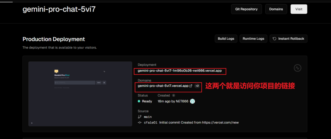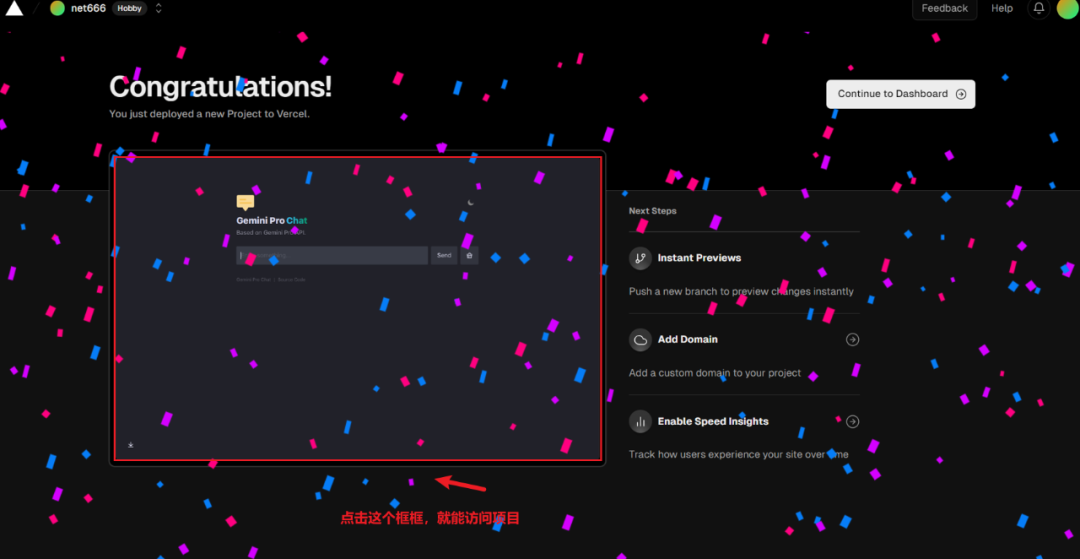 部署成功后,你将看到如下图,表示部署成功,点击左侧框框就能跳转访问项目。