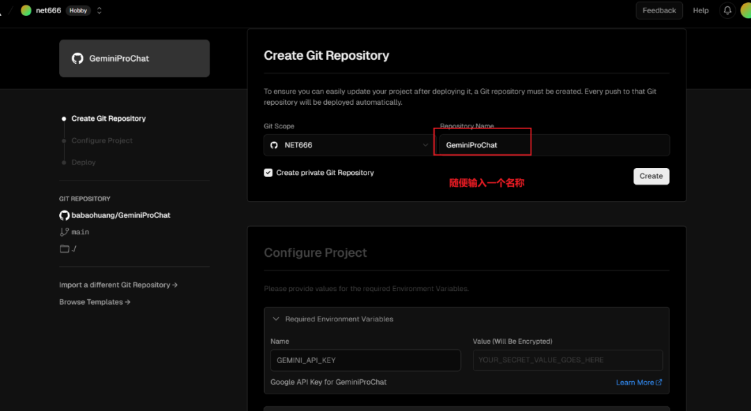 懂编程的小伙子,访问这个项目,跟着步骤进行本地搭建,也可以通过 Vercel 平台进行一键部署,完全免费,访问开源项目 GeminiProChat后,下拉页面,找到Deploy,点击跳转Vercel平台登录后进行部署。