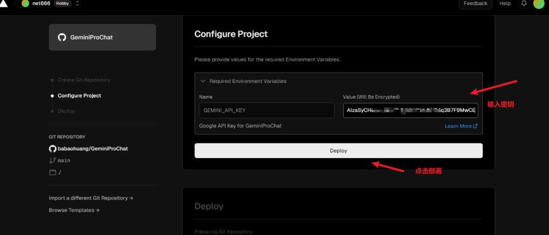 输入Gemini 秘钥,点击Deploy部署,等待部署完毕即可,如下图。