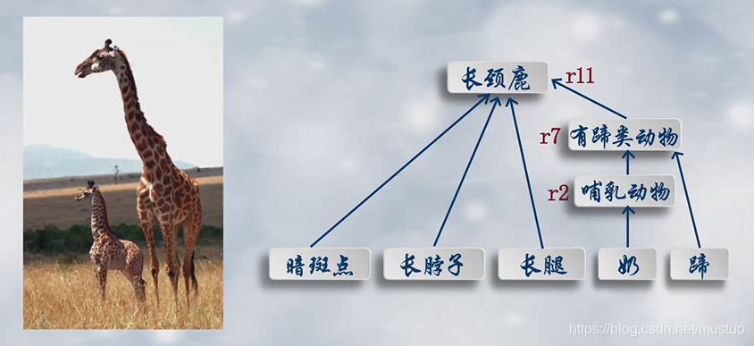 2. 现有已有知识:{暗斑点,长脖子,长腿,奶,蹄},放入综合数据库