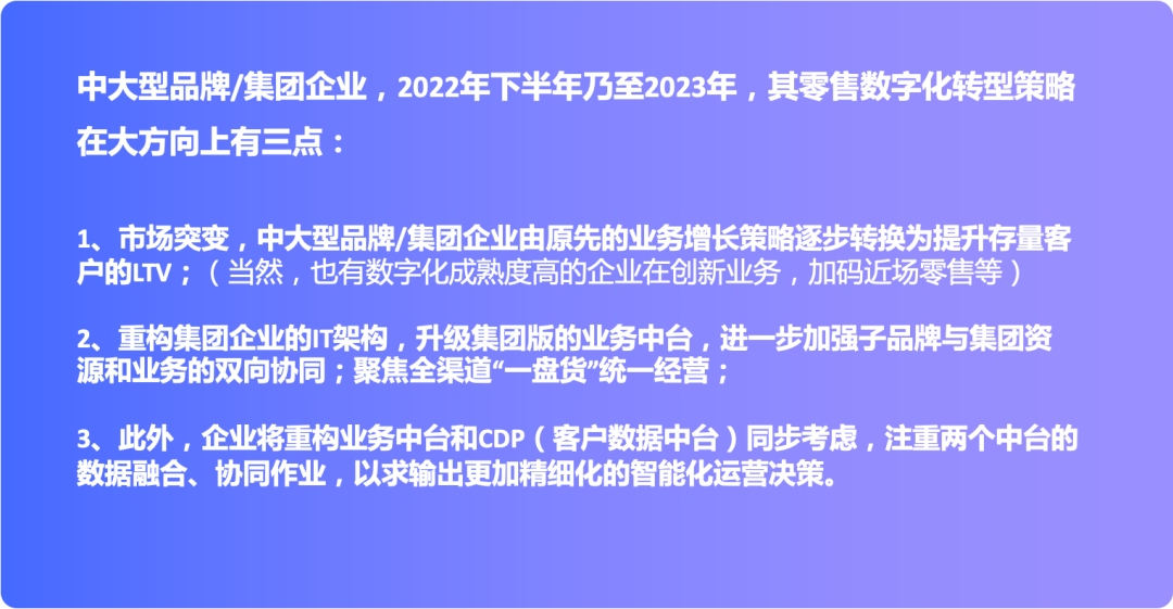 笔者总结了一下,中大型品牌/集团企业,2022年下半年乃至2023年,其零售数字化转型策略在大方向上有三点: